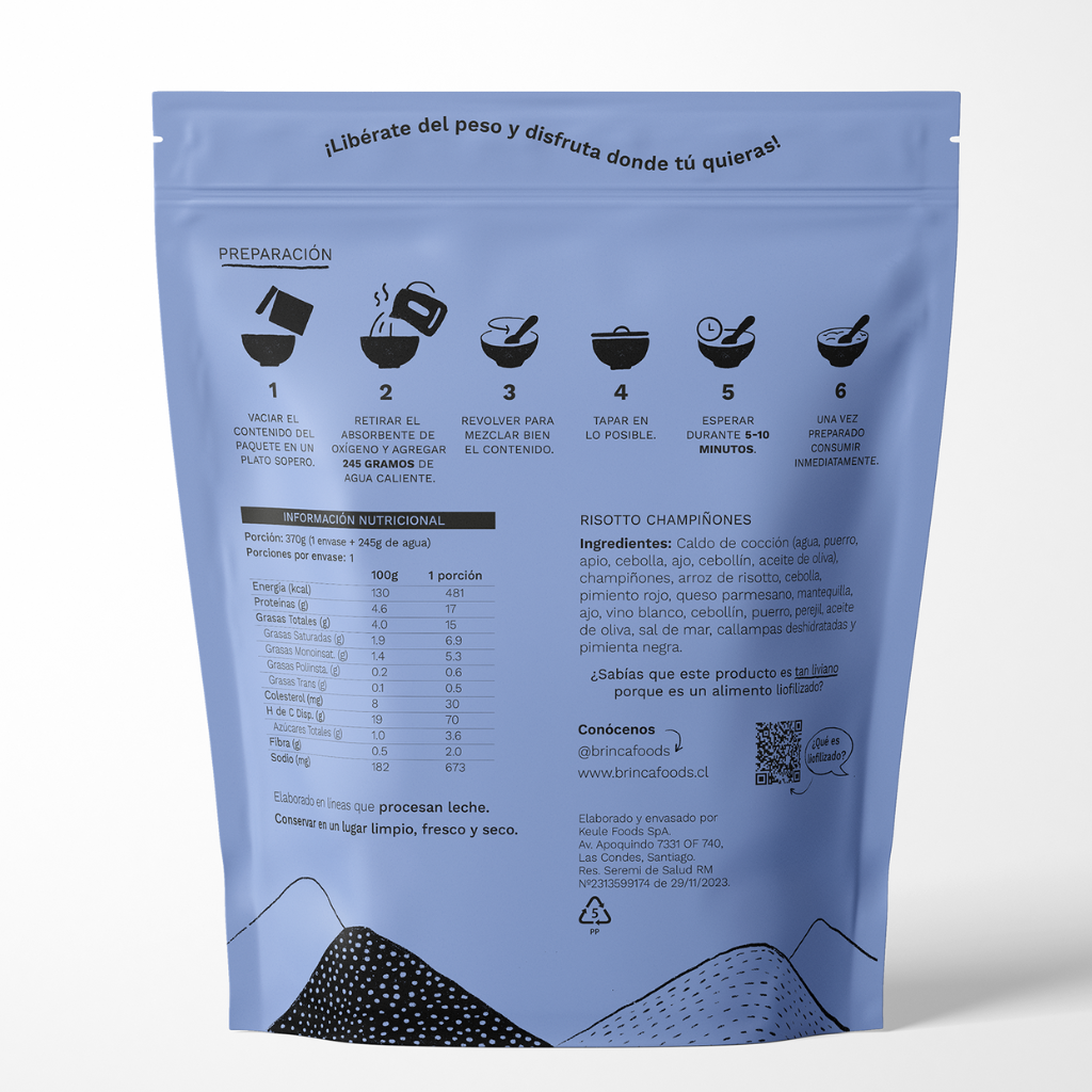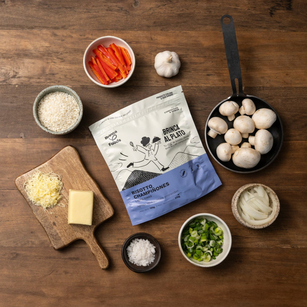 Caldo de cocción (agua, puerro, apio, cebolla, ajo, cebollín, aceite de oliva), champiñones, arroz de risotto, cebolla, pimiento rojo, queso parmesano, mantequilla, ajo, vino blanco, cebollín, puerro, perejil, aceite de oliva, sal de mar, callampas deshidratadas y pimienta negra.